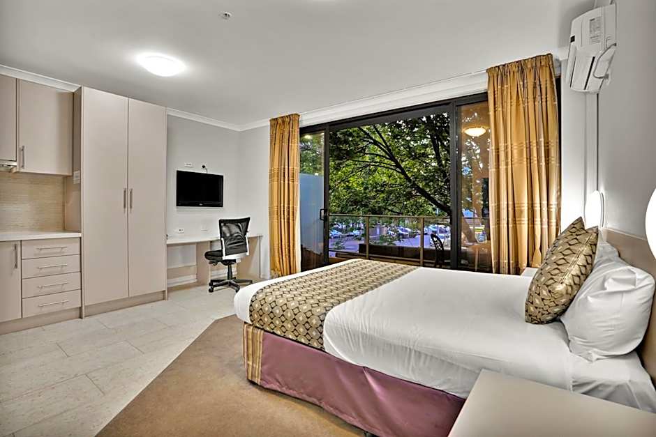 This spacious suite, overlooks Lygon Street. It includes a queen-sized bed, an private bathroom, a kitchenette and a spacious balcony.